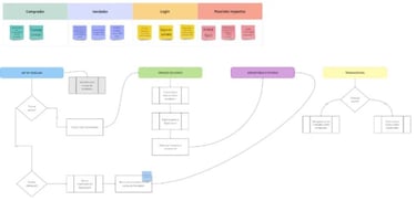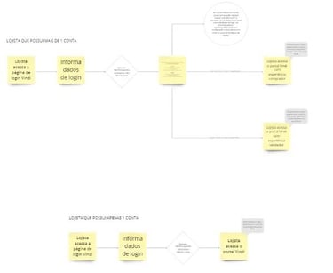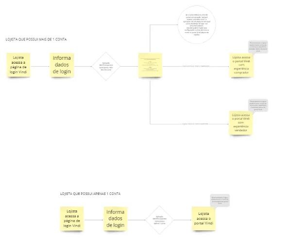 Após levantarmos todas estas referências, partimos para o desenho de fluxos de como seria a experiência de se logar na Vindi quando a pessoa tivesse uma conta de comprador e uma conta de vendedor utilizando o mesmo CPF.